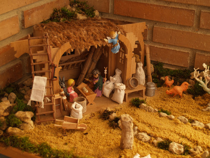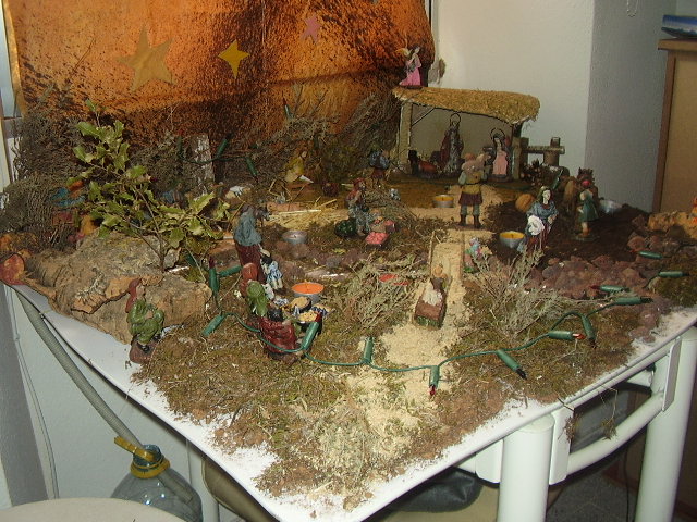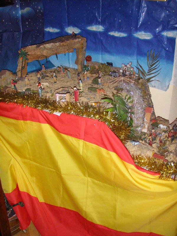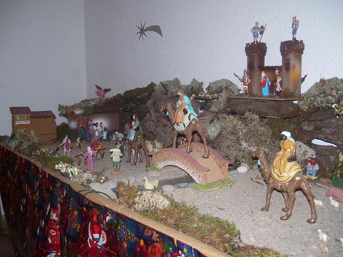 Aunque hace días pensé mandar las fotos de nuestro belén no he podido hacerlo hasta hoy; os mando varias fotografías del belén que cada año montamos en casa, lo hacemos siempre el día 7 u 8 de diciembre y salimos al campo mis dos hijos (de 8 y 2 años) y yo, a recoger piedrecitas, ramitas, musgo y lo que necesitamos, luego entre los tres colocamos las figuras y las plantas, las piedras...Cada año lo hacemos distinto y como hemos vivido en muchos sitios distintos en cada lugar hemos aprovechado la vegetación característica para formar el belén, este año ha tocado en La Mancha y hemos cogido tomillo, musgo y piedras volcánicas que aquí hay muchas; como hay varias fotos coged la que más os guste. No me importa que figure mi nombre, me llamo Santiago y mis dos hijos se llaman Santiago y Pilarín y os escribo desde Miguelturra, (Ciudad Real) donde por cierto no se puede oir esRadio; sé que es difícil que en una provincia socialista como esta alguien quiera significarse contra el gobierno de la nación y de la comunidad autónoma, (que en este caso en el mismo) al fin y al cabo aquí todo está subvencionado y rara es la persona que no vive del presupuesto de algún organismo público y seguro que ninguna emisora se arriesga a perder la publicidad institucional, pero deberíais intentar coger alguna emisora en esta provincia porque llevar el portátil a cualquier sitio de la casa o de la oficina no es cómodo. No me enrrollo más, ahí van las fotos, FELIZ NAVIDAD y PRÓSPERO AÑO NUEVO.