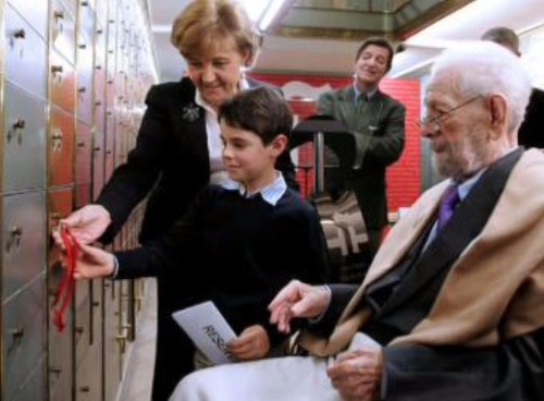 El cineasta Luis García Berlanga, junto a su nieto y a la directora del Instituto Cervantes, Carmen Caffarel, durante un acto de entrega de su legado a la Caja de las Letras de la institución celebrado este año.