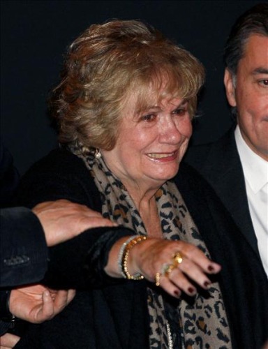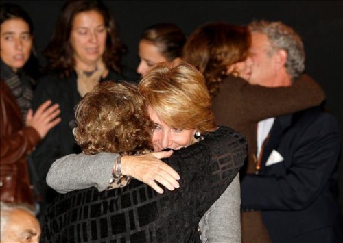 La presidenta de la Comunidad de Madrid, Esperanza Aguirre (d), abraza a la viuda del cineasta Luis García Berlanga, María Jesús Manrique. EFE/Kote