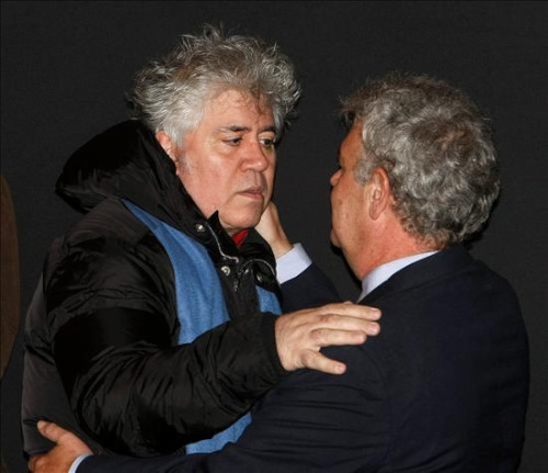 El cineasta Pedro Almodóvar consuela a José Luis Berlanga, hijo del fallecido Luis García Berlanga, en la capilla ardiente de su padre.