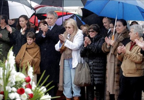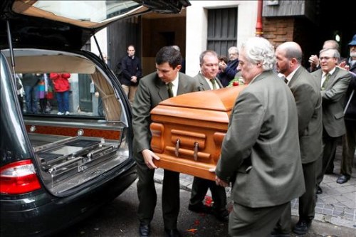 La viuda de Luis García Berlanga, María Jesús Manrique (5d), y su hijo José Luis García Berlanga (a su derecha), acompañados por la actriz Concha Velasco (4d), la ministra de Cultura (3d), la actriz Mónica Rabal (2d) y el actor Guillermo Montesinos (d), entre otros familiares y amigos, dan el último adiós al cineasta Luis García Berlanga.