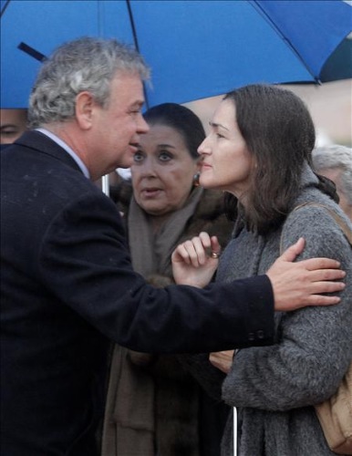 El hijo del cineasta Luis García Berlanga, José Luis García Berlanga (i), conversa con la ministra de Cultura Ángeles González-Sinde (d), en presencia de la actriz Mónica Rabal (c), durante el funeral en Pozuelo de Alarcón.