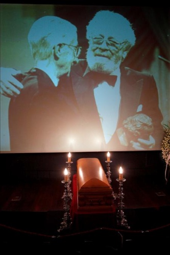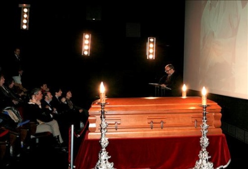 Imagen del féretro que contiene los restos mortales del cineasta Luis García Berlanga con imágenes del director en la entrega de los Premios Goya de fondo durante la capilla ardiente que se ha instalado esta tarde en la Academia de Cine en Madrid, en la que proyectan fotografías de la trayectoria del presidente de honor y cofundador de la institución.