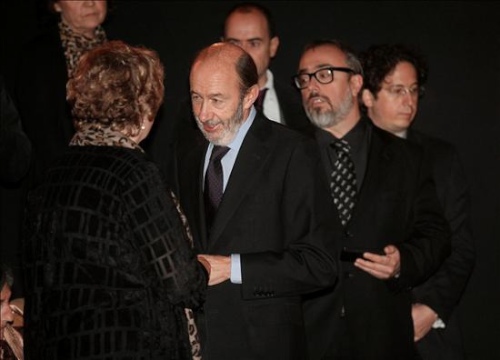 El vicepresidente primero del Gobierno, Alfredo Pérez Rubalcaba (2i), conversa con la viuda de Luis García Berlanga, María Jesús Manrique (i), ante el presidente de la Academia de Cine español, Álex de la Iglesia (2d).