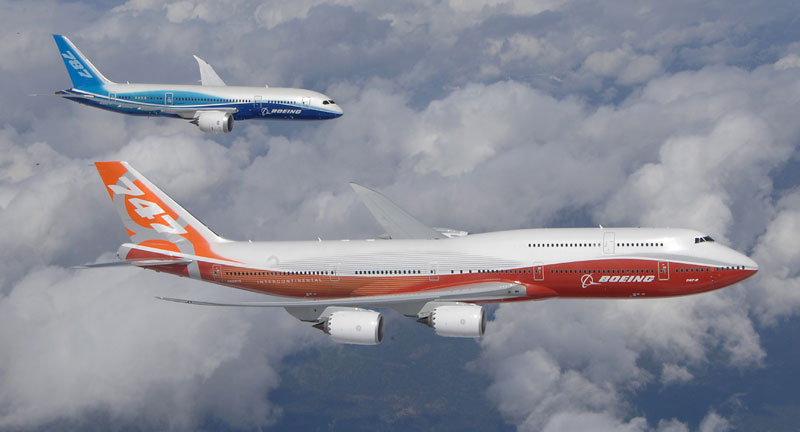 El veterano Jumbo y un novísimo 787 vuelan juntos durante una de las pruebas del Dreamliner. Dos generaciones de aviones.
