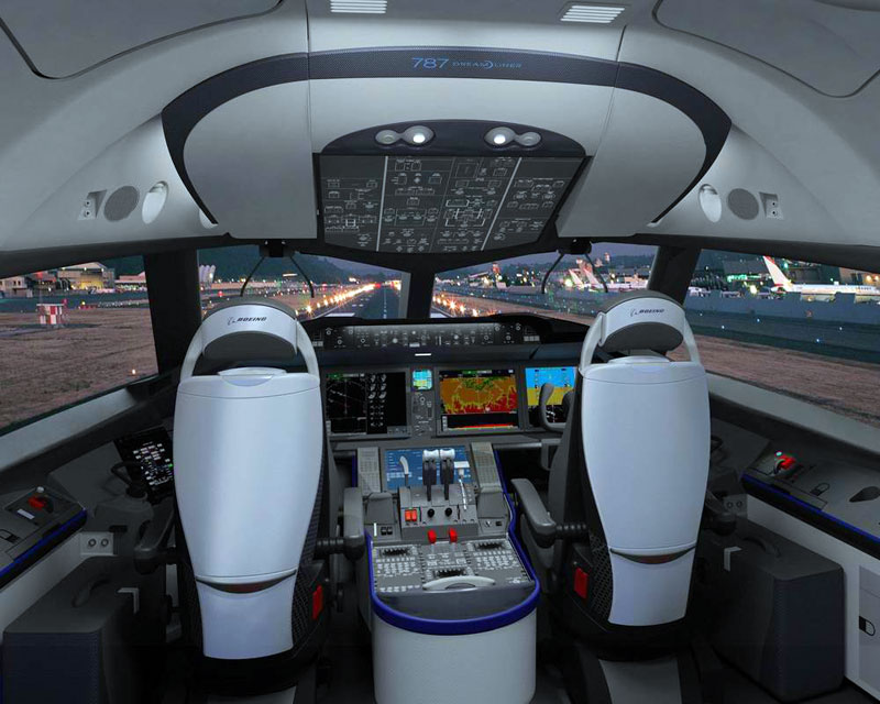 La cabina de los pilotos presenta este aspecto tan futurista. Como en todos los aviones de última generación abundan las pantallas planas.