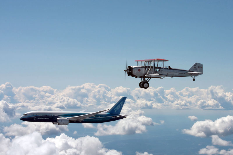 Un biplano de tiempos de la Primera Guerra Mundial vuela junto al Dreamliner. Casi 100 años de aviación comercial se condensan en esta imagen.