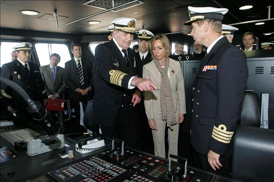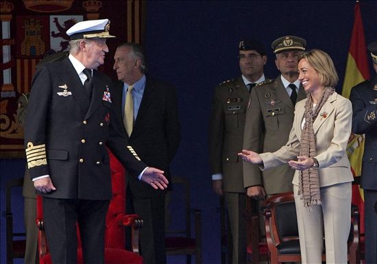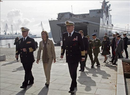 El Rey, junto a la ministra de Defensa, Carmen Chacón, y el jefe del Estado Mayor de la Armada, Manuel Rebollo