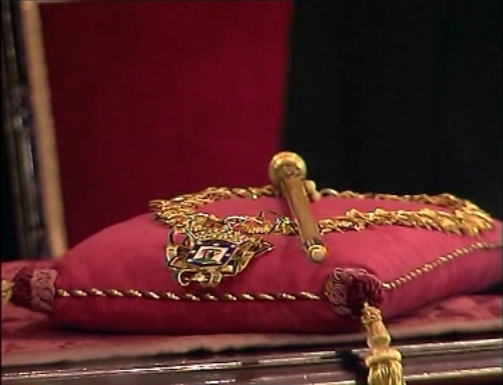 En el salón de plenos del Ayuntamiento de Madrid, detalle del bastón de mando y escudo de la Villa de Madrid. (LDTV)