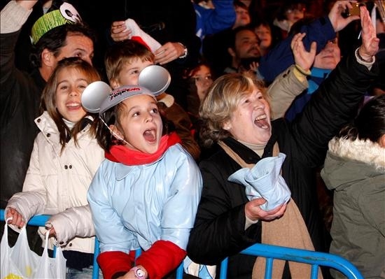Niños y mayores saludan entusiasmados a los Reyes Magos en la cabalgata de Madrid. EFE/Manuel H. de León.