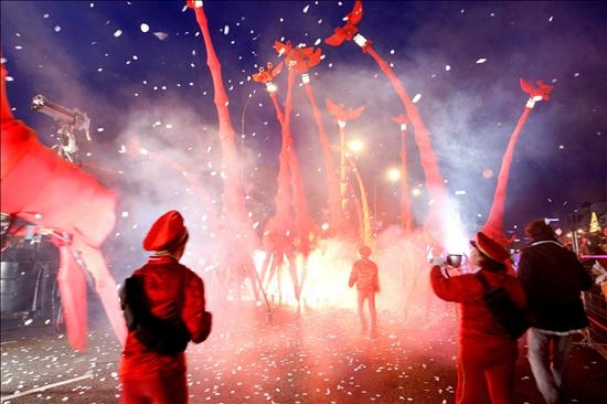 Un grupo de jirafas rojas de ocho metros de altura, movidas desde el interior por los miembros de la compañía francesa 'Off', es uno de los espectáculos que forma parte de la tradicional cabalgata de Reyes de Madrid. EFE/Manuel H. de León.