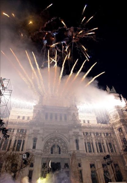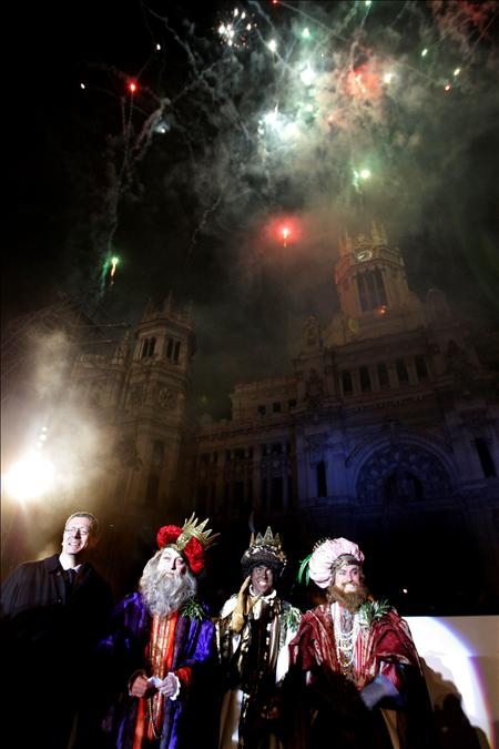 Espectáculo pirotécnico desde la Real Casa de Correos al término de la tradicional Cabalgata de Reyes de Madrid, que este año está inspirada en "La vuelta al mundo en 80 días" y celebra el Año Internacional de Acercamiento de las Culturas, proclamado por la ONU, con 120 pajes vestidos con trajes de los cinco continentes y personajes como la "dama de la paz" y una carroza protagonizada por niños con síndrome de Down. EFE/Alberto Martín