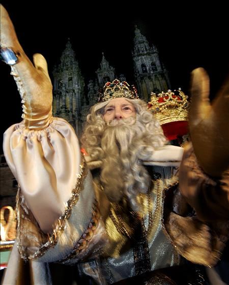 El rey Melchor a su llegada a la Plaza del Obradoiro en Santiago de Compostela, donde repartió cientos de regalos a los niños coincidiendo con el inicio del Año Santo. EFE/X.REY