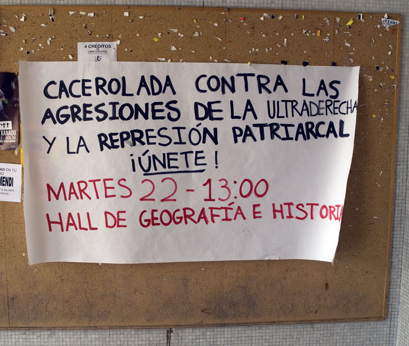 El corcho de la entrada de la facultad de Geografía e Historia avisaba de la convocatoria. La cacerolada era contra "las agresiones de la ultraderecha y la represión patriarcal" (sic).