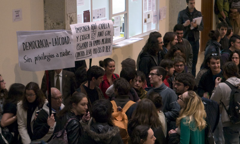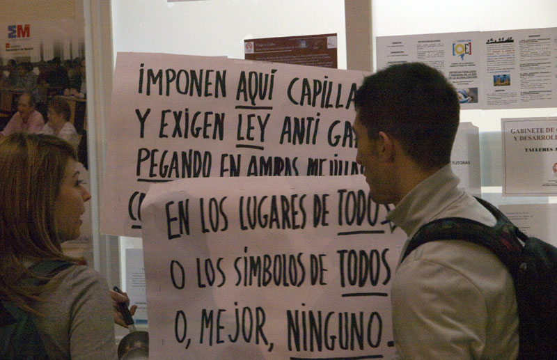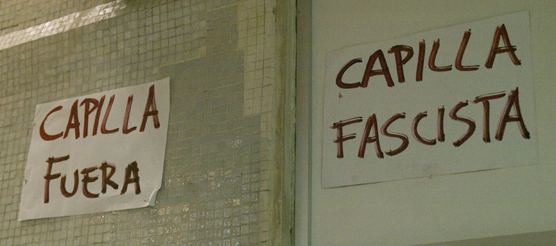 Las pancartas se han improvisado sobre folios en blanco. En esta pared de uno de los pasillos se puede leer "capilla fuera" y luego "capilla fascista".