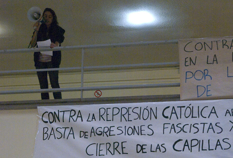 Una joven se ha subido a la segunda planta del atrio y desde allí ha leído el manifiesto. Debajo de ella una pancarta que denuncia la "represión católica".