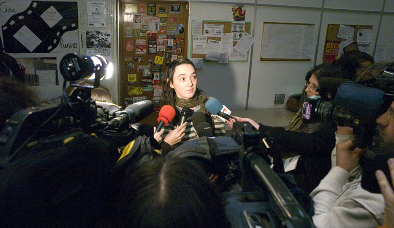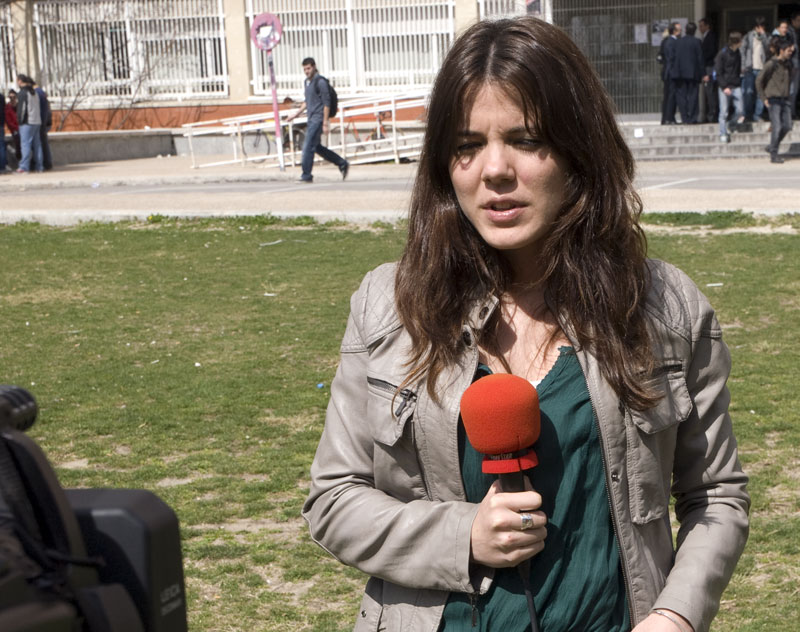 La redactora de LDTV, Paloma Cuevas, ha tenido que cambiar de micrófono para evitar indeseados encontronazos con los estudiantes más radicales.