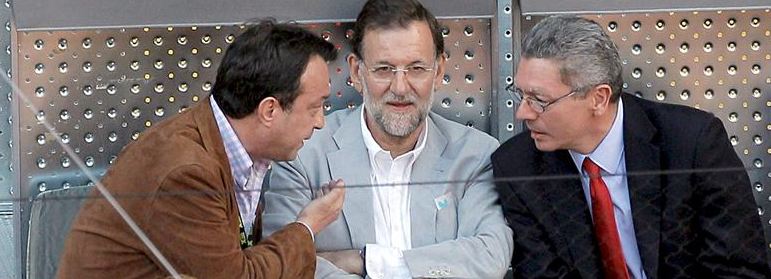 El presidente del PP, Mariano Rajoy (c), conversa en la grada con el alcalde y el vicealcalde de Madrid, Alberto Ruiz Gallardón (d) y Manuel Cobo, respectivamente.