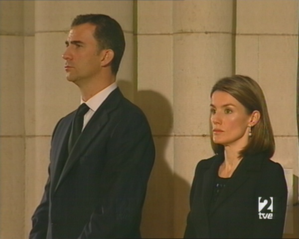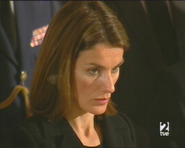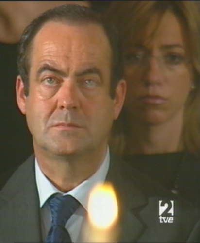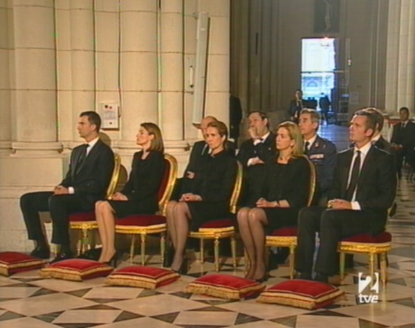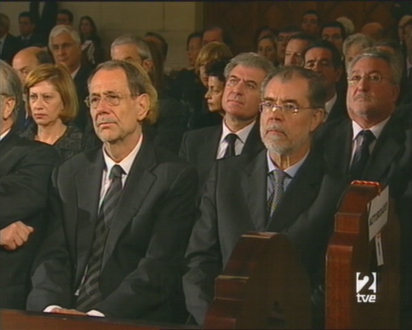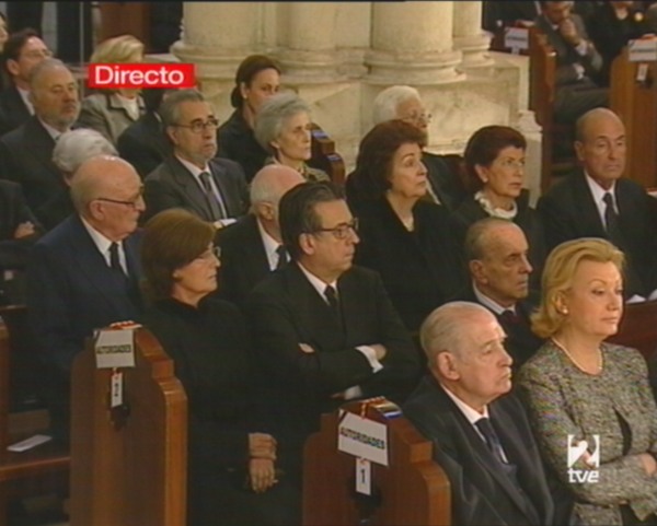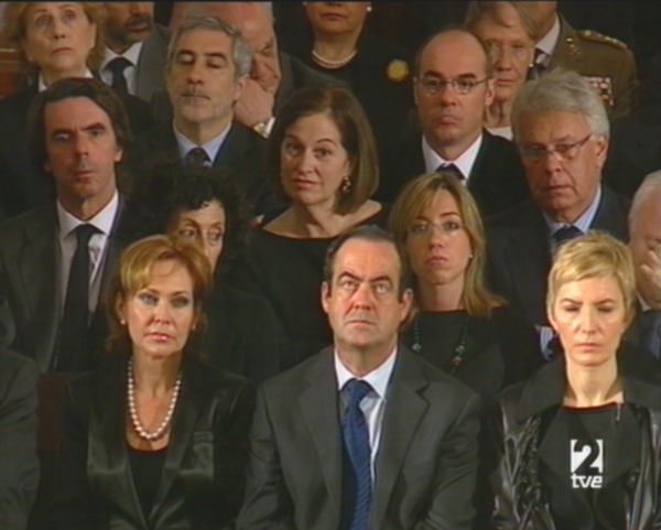 La esposa del presidente del Gobierno, Sonsoles Espinosa; el ministro de Defensa, José Bono, junto a su esposa, Ana Rodríguez; la ministra de Defensa, Carmen Chacón; la ministra de Educación, Mercedes Cabrera; el ex presidente del Gobierno, Felipe González; el ex presidente del Gobierno, José María Aznar; y el coordinador general de IU, Gaspar Llamazares. (Imagen TV)