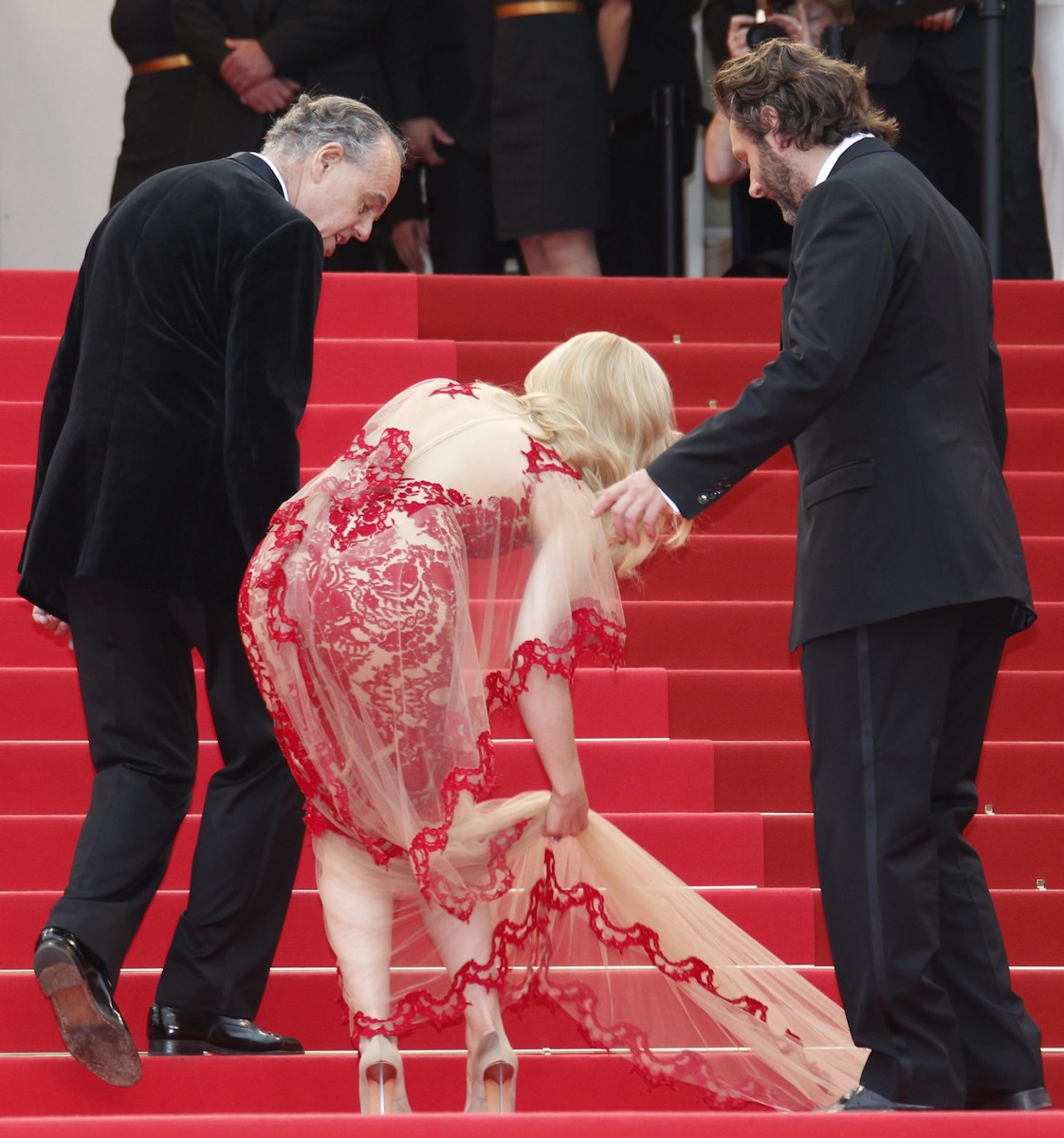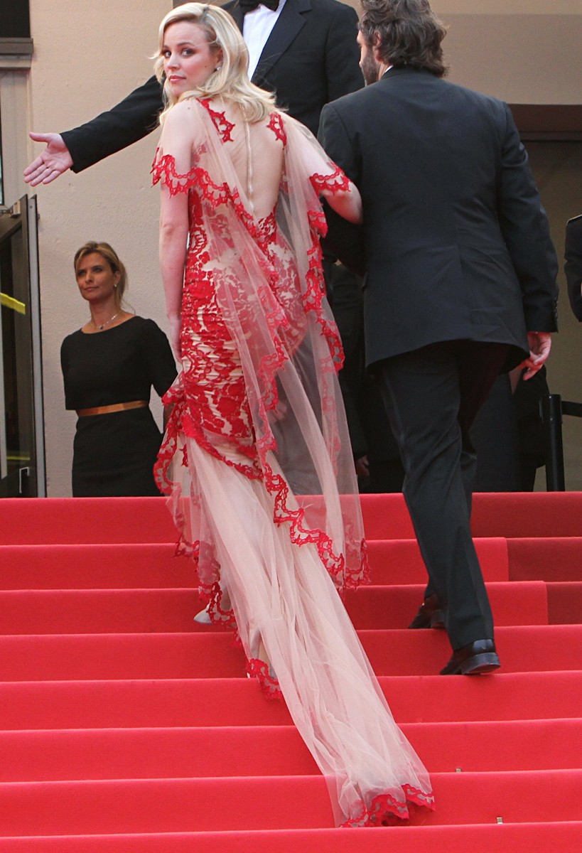 Michael Sheen ayuda a su compañera de reparto Rachel McAdams en Midnight in Paris, junto al ministro de Cultura de Francia Frederic Mitterrand.