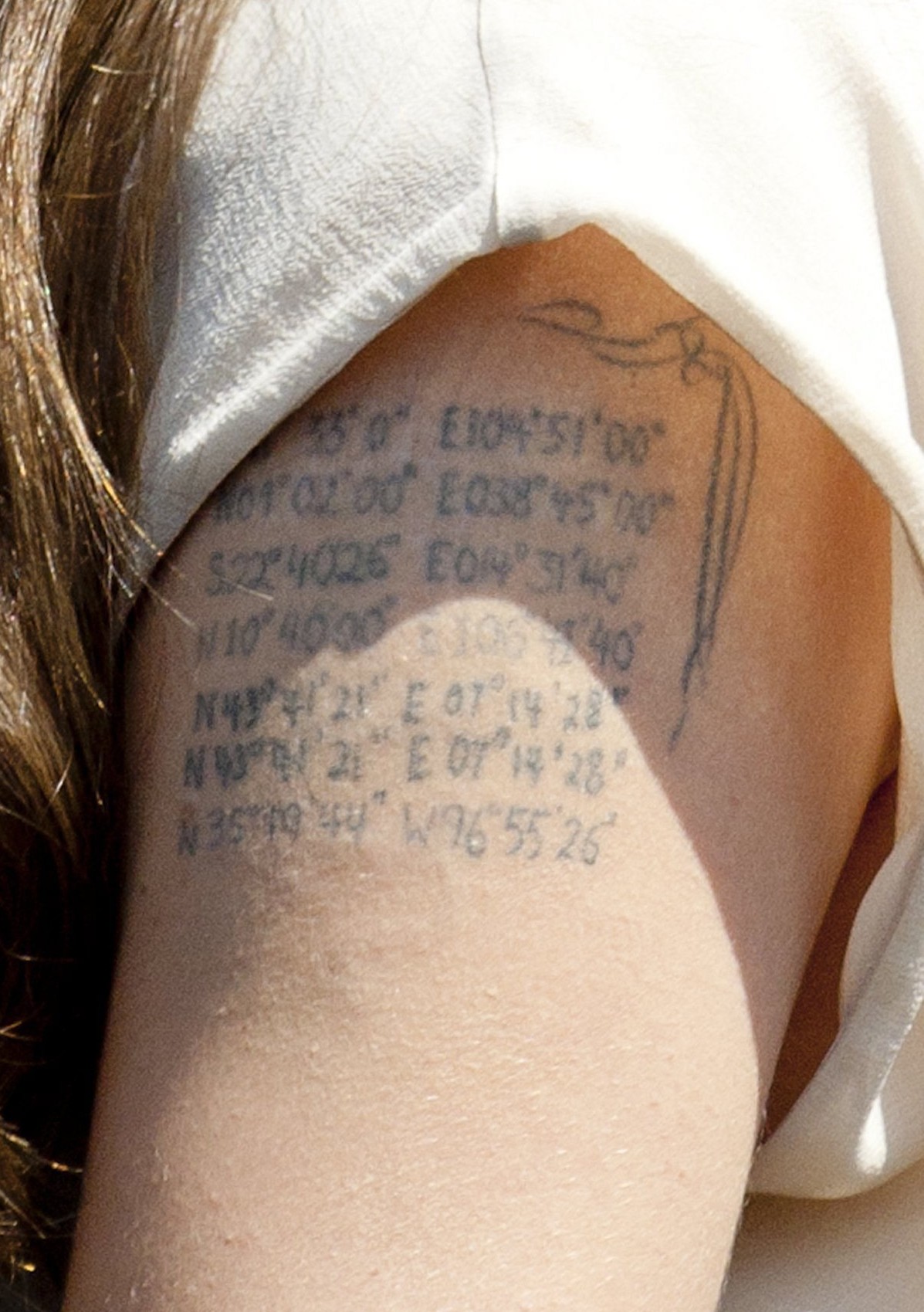 Las coordenadas del lugar de nacimiento de Brad Pitt tatuadas en el brazo de Angelina Jolie.