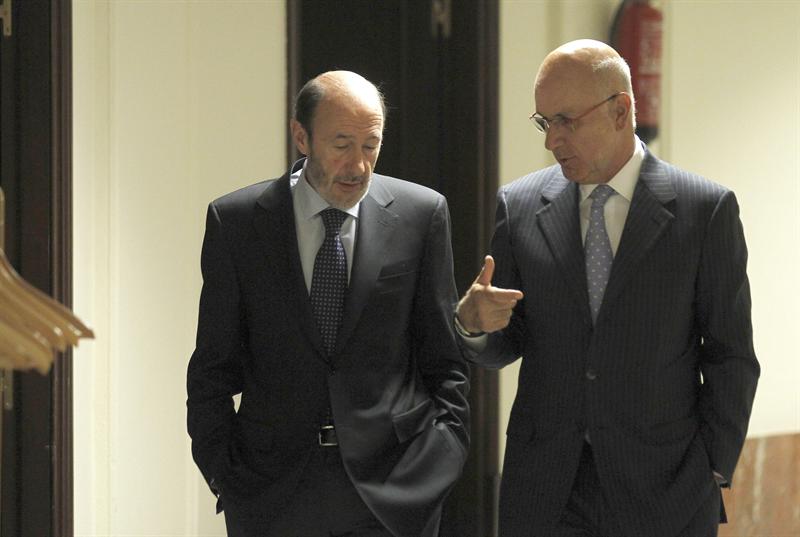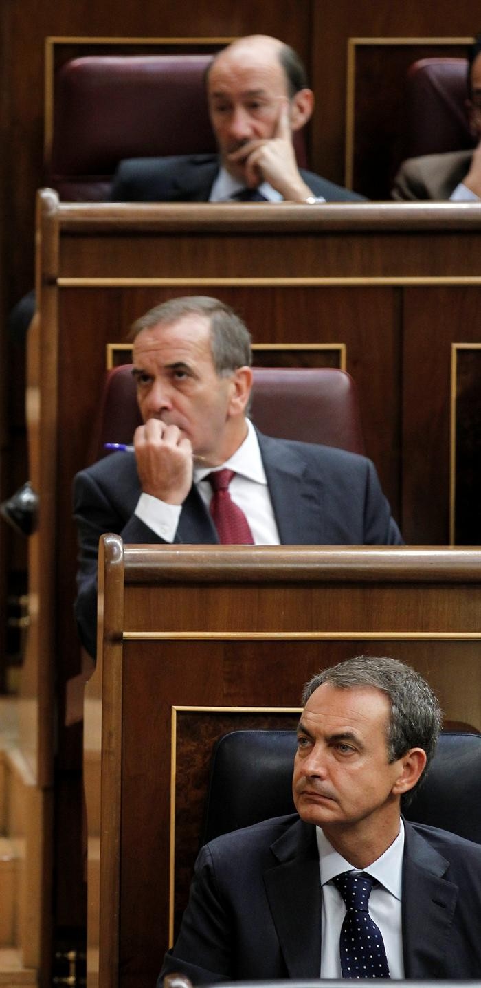 Gesto serio en los rostros del presidente, el portavoz parlamentario, que tenía que dar la cara ante los diputados del PSOE, y el candidato.