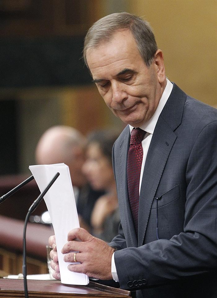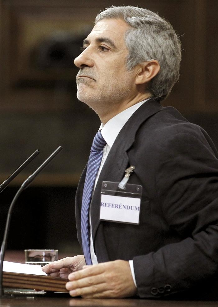 Gaspar Llamazares, el más indignado en el turno de los portavoces de los partidos minoritarios. Hasta lució un cartel en su chaqueta pidiendo el referéndum.
