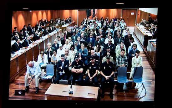 El banco de los acusados, donde se puede ver al ex asesor de urbanismo del Ayuntamiento de Marbella, Juan Antonio Roca (2i), tomada desde uno de los monitores en la sala de prensa de la Audiencia Provincial de Málaga.