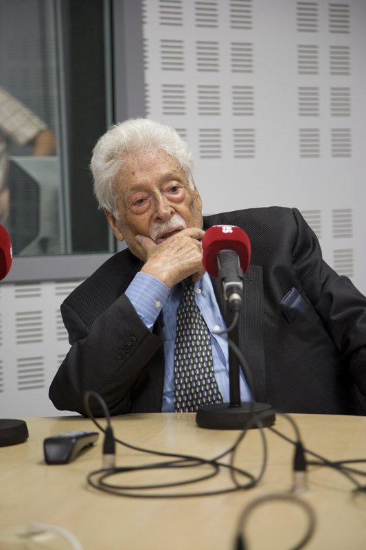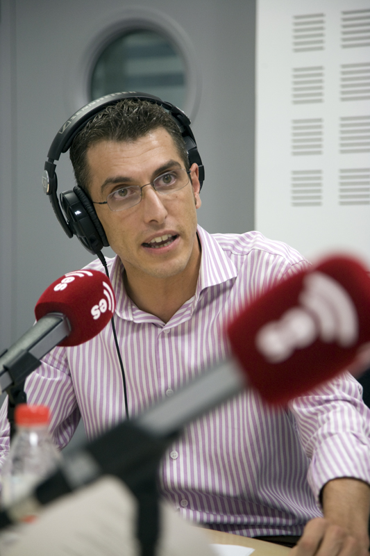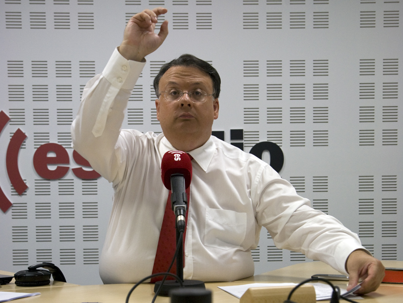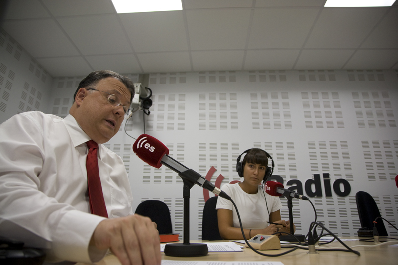 El profesor Barea escucha la información económica minutos antes de la tertulia.