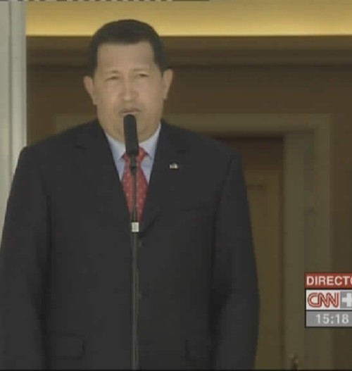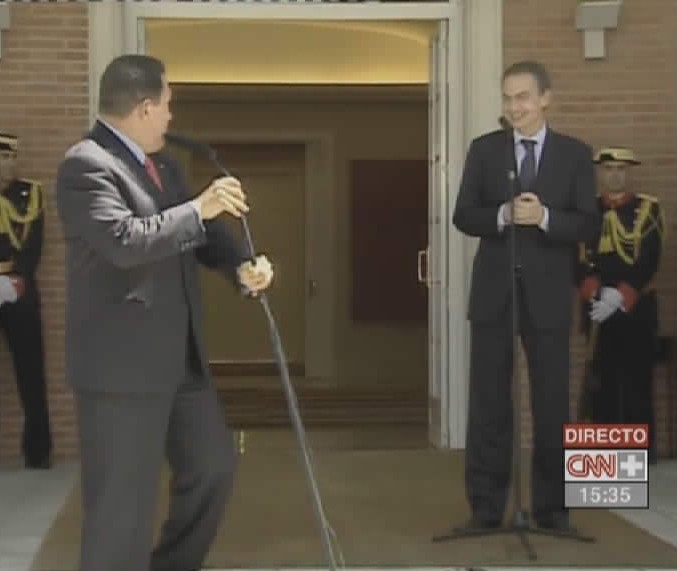 Hugo Chávez bromea con los periodistas sobre el calor de Madrid, y trata de acercarse al sol. Zapatero mira perplejo la bufonada del presidente venezolano.
