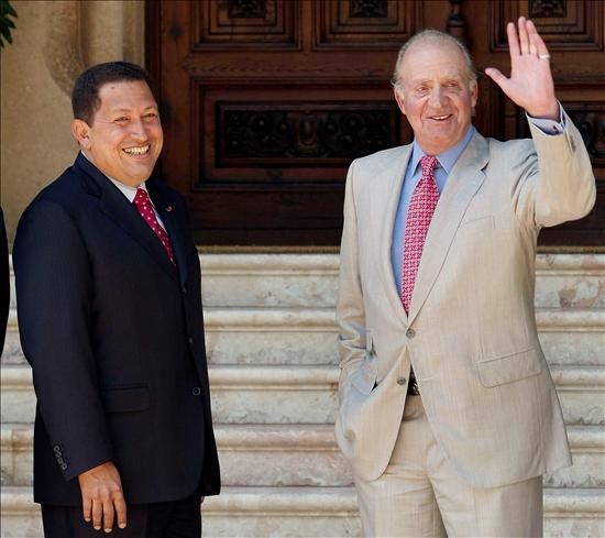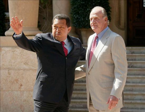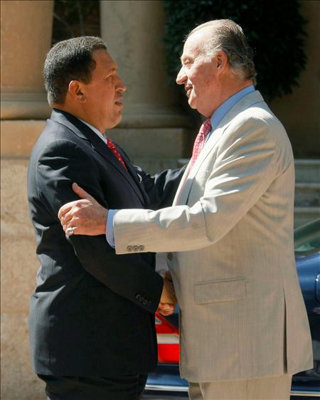 El Rey saluda a Hugo Chávez a su llegada al palacio de Marivent. (EFE)
