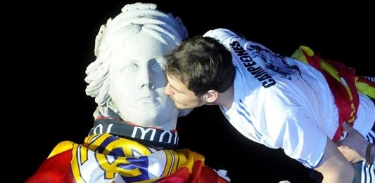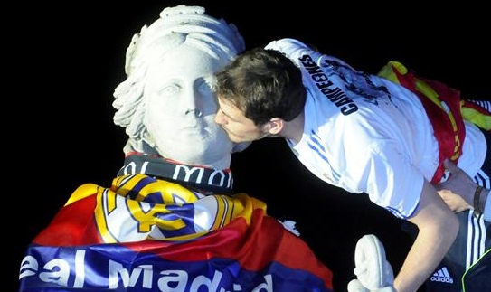 El capitán del Real Madrid y héroe de la final de Mestalla, Iker Casillas, besa a la Diosa para poner punto final a las celebraciones del título de Copa del Rey.