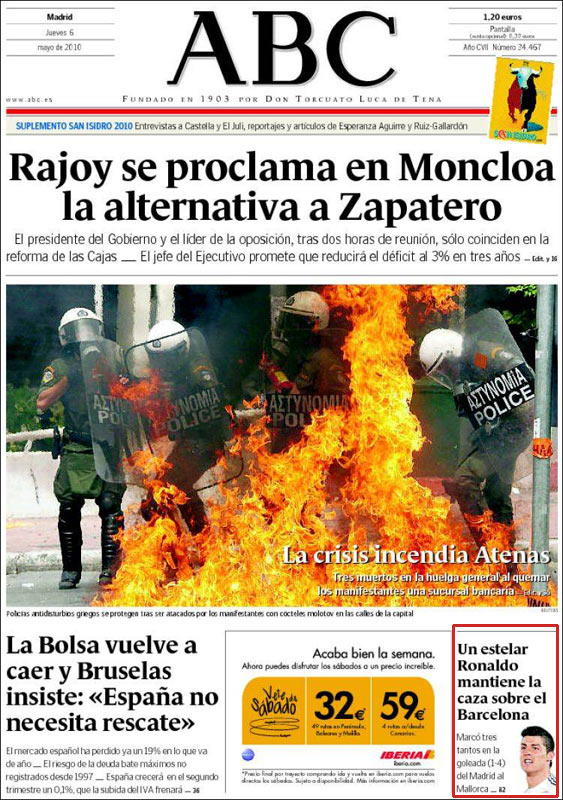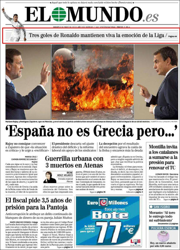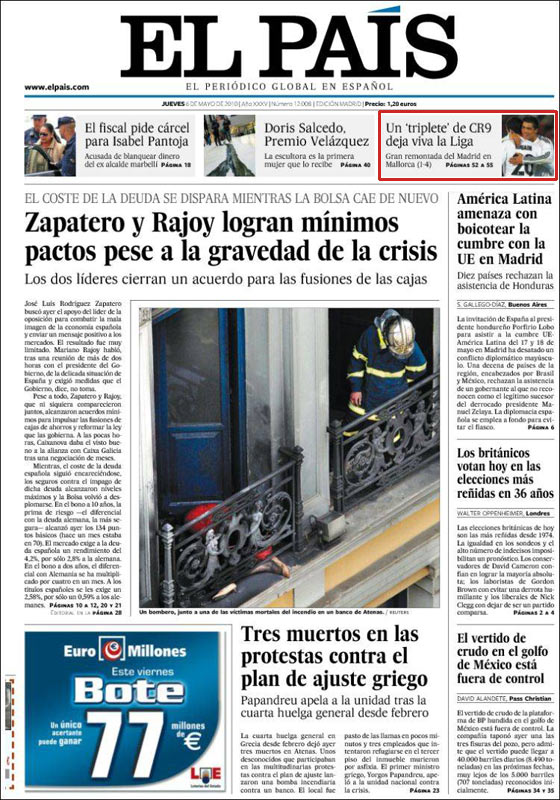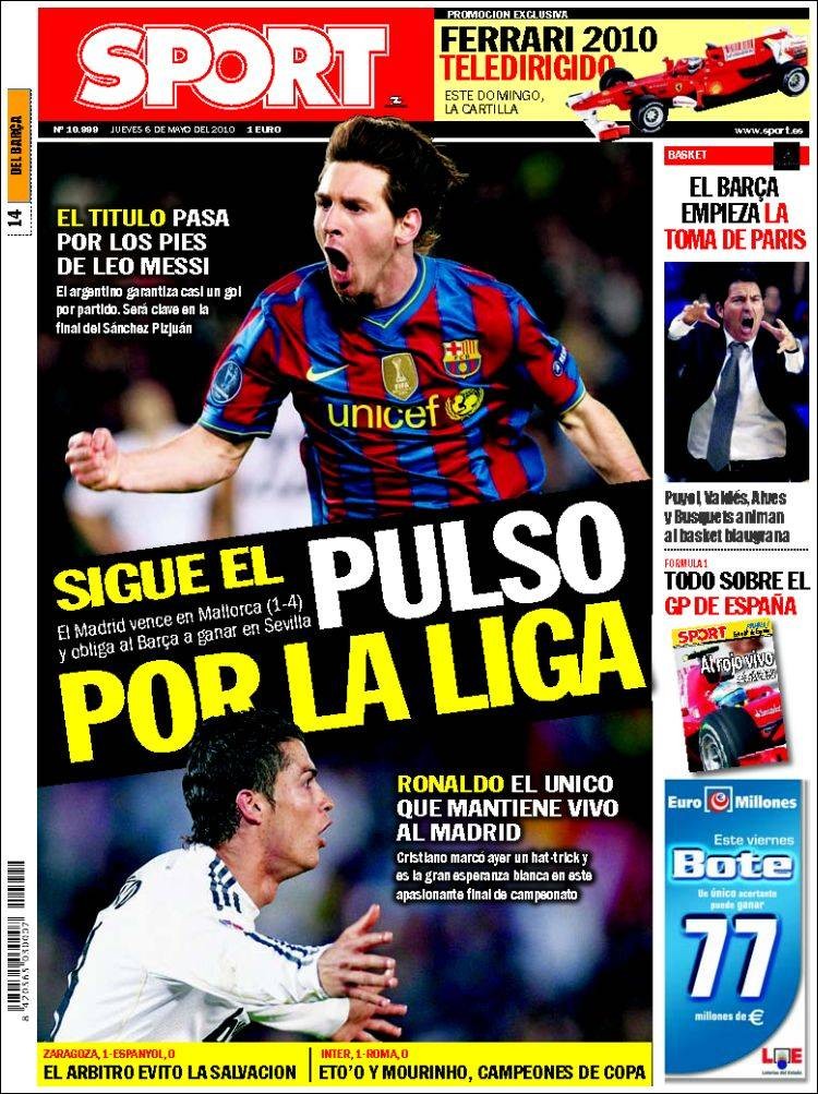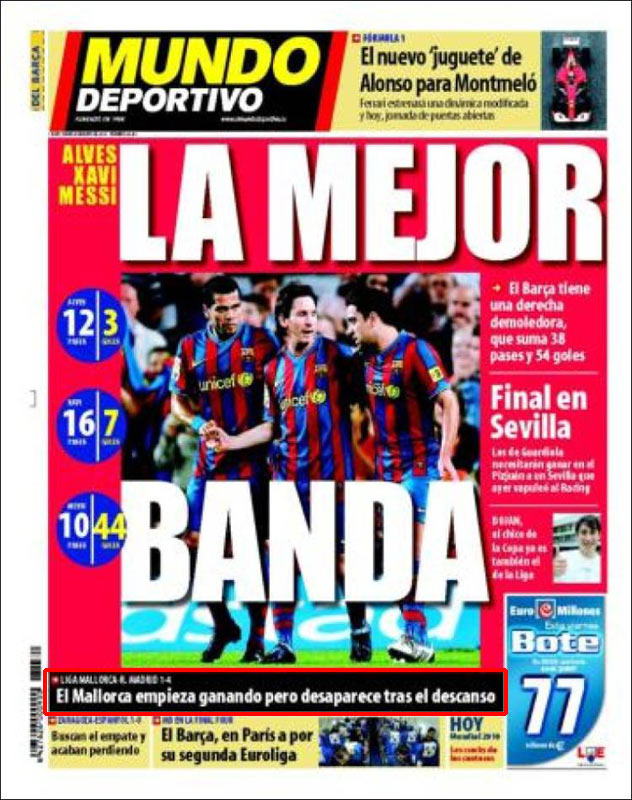 La noticia de la victoria del Madrid, que mantiene viva la Liga y que mete presión al Barça, hay que buscarla en su portada, ya que al parecer no tiene la suficiente importancia. Además, el partido, dicen, no fue ganado por el Real Madrid sino perdido por el Mallorca.