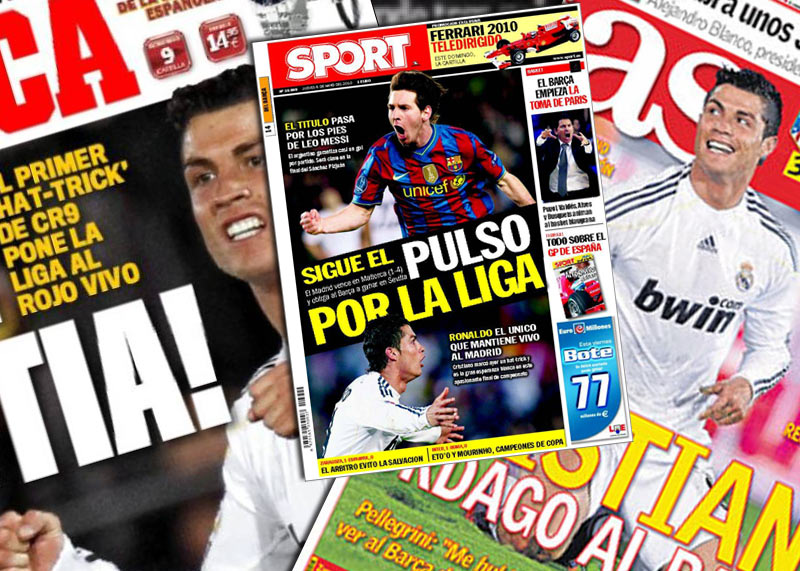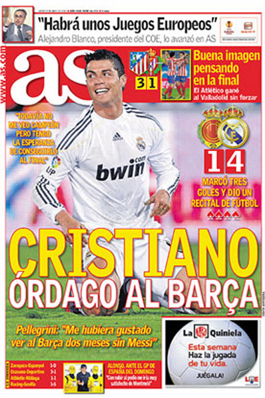 Para el diario deportivo madrileño Ronaldo es el Real Madrid y el auténtico protagonista de la portada y destaca que el portugués lanza un "órdago al Barça".