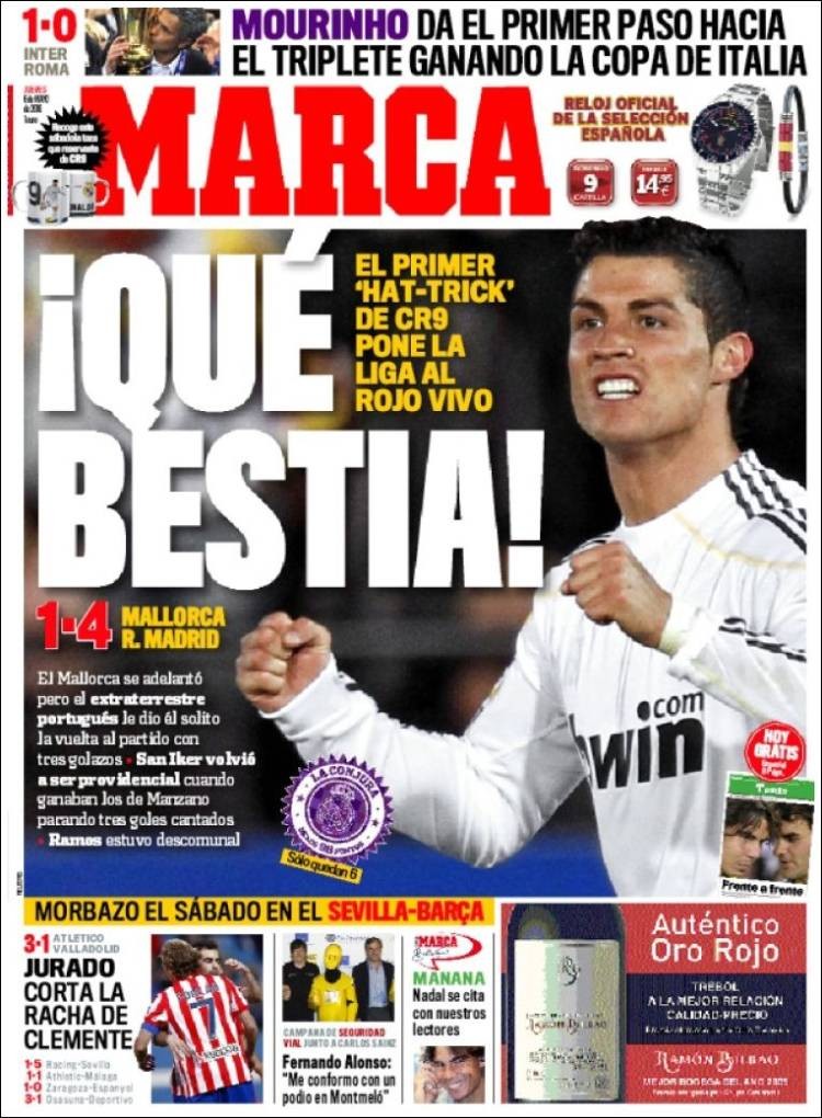 El diario Marca destaca el partidazo de Cristiano y le califica de "bestia". Además, destaca que es su primer triplete en el Real Madrid.