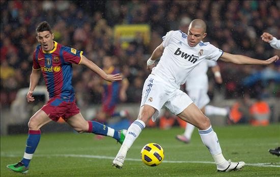 El defensa portugués del Real Madrid Kléper Laveran "Pepe" (d) controla el balón ante el delantero del F.C. Barcelona David Villa, durante el partido, correspondiente a la decimotercera jornada de Liga de Primera División, que ambos equipos disputan esta noche en el Nou Camp.