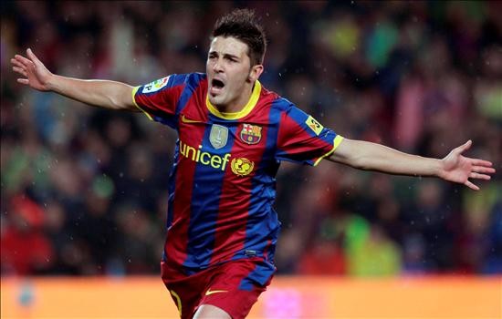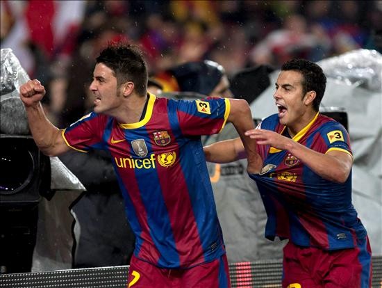 El delantero del F.C. Barcelona Pedro Rodríguez (d) celebra con su compañero David Villa el gol que ha marcado al Real Madrid, segundo para el conjunto azulgrana.