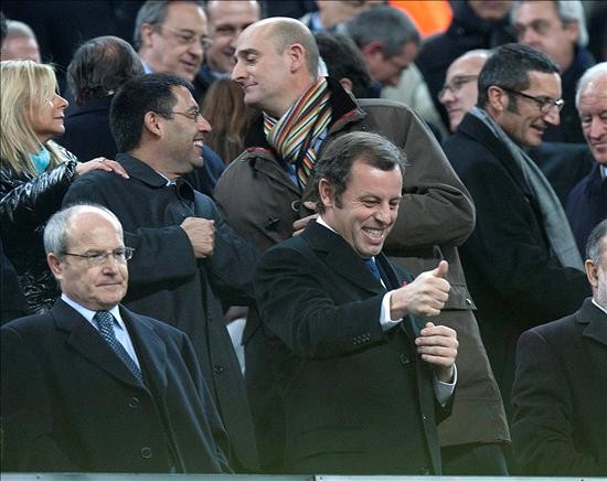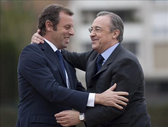 El portugués Kléper Laveran 'Pepe' (2i), y el brasileño Marcelo (2d), discuten una jugada con los jugadores del F.C. Barcelona, Andrés Iniesta (i) y Sergio Busquets (3d).