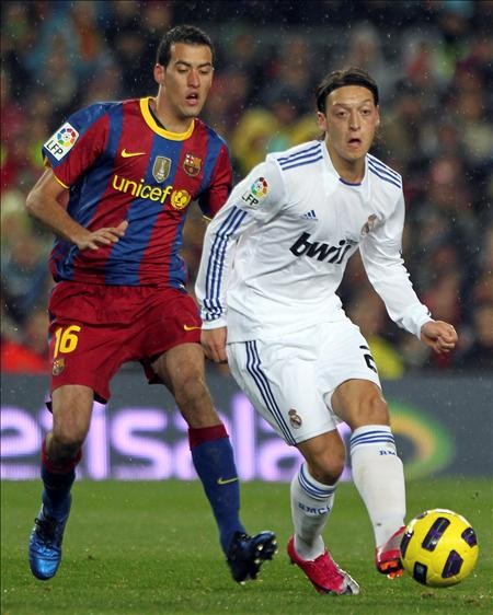 El centrocampista del FC Barcelona Busquets (i) presiona al alemán Ozil.