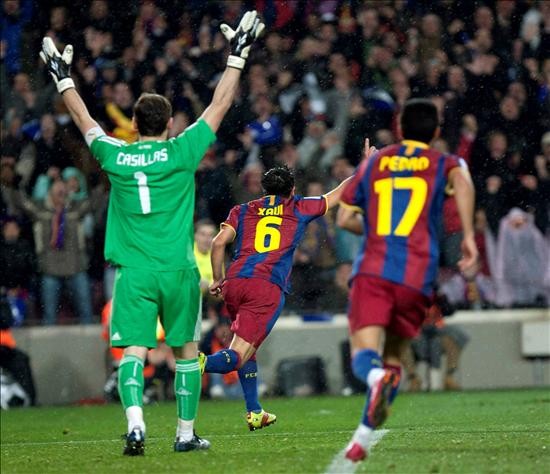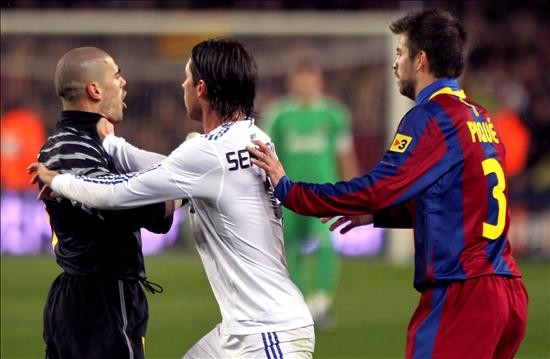 Sergio Ramos entre Valdés y Piqué en uno de los momentos más tensos de la primera parte.