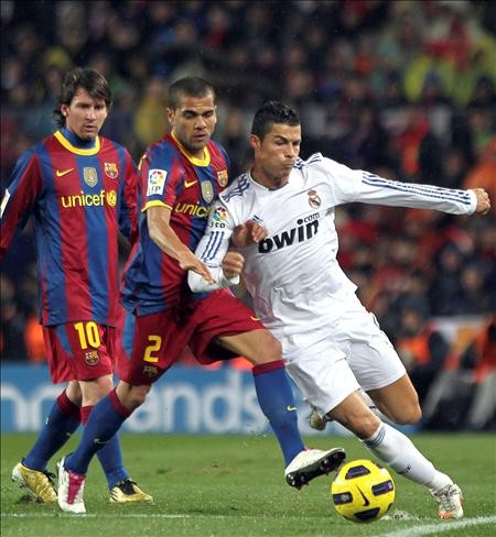 El delantero portugués del Real Madrid Cristiano Ronaldo (d) lucha un balón con los jugadores del F.C. Barcelona, el brasileño Davi Alves (c) y el argentino Leo Messi (i).