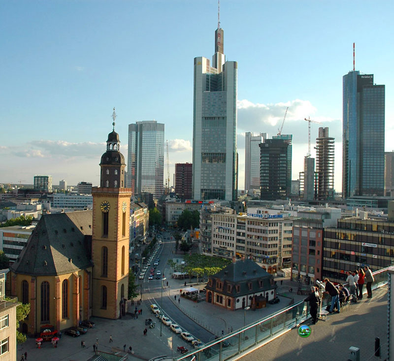 Los alemanes son los individuos más ahorradores del mundo desde hace mucho tiempo. La tasa de ahorro del país roza el 12%, es decir, de cada 100 euros guardan 12 para el futuro capitalizándolos a través de la banca o directamente en Bolsa. En la imagen el barrio financiero de Fráncfort, a orillas del río Meno, lugar a donde van a parar buena parte de los ahorros de los alemanes. La sede del Commerzbank (centro) y la del BCE (izqda) son dos de los rascacielos más altos de la ciudad.