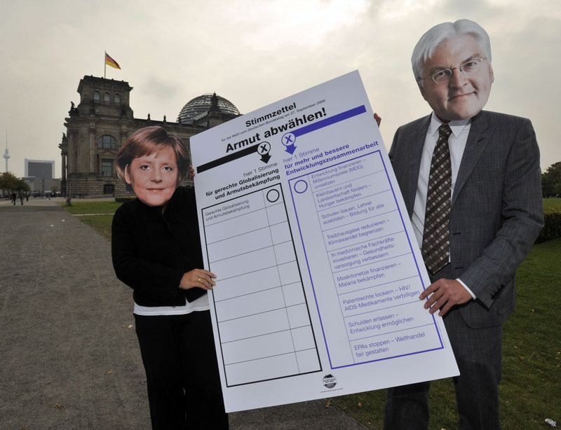 A los alemanes no les gustan los experimentos y valoran mucho la estabilidad política. Un ejemplo de esto fue el pacto de concentración entre conservadores y socialdemócratas durante la pasada legislatura, cuando la crisis económica arreciaba. En Alemania, además, no tienen problemas de identidad y las regiones compiten entre sí, pero no por ver quien regula más o quien tiene más organismos regionales, sino por quien produce más y mejor. En la imagen dos activistas de Acción contra la Pobreza se fotografían en el centro de Berlín ataviados con caretas de Angela Merkel (CDU) y Frank-Walter Steinmeier (SPD). La concordia parece reinar entre los políticos alemanes para los asuntos que importan.
