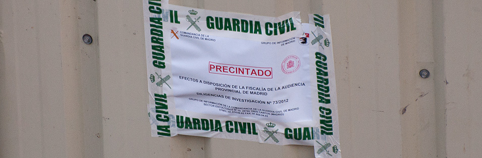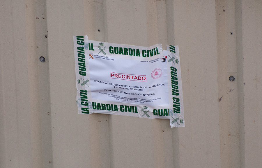 Cartel en el que se dan detalles del precinto cómo que se trata de efectos "a disposición de la Audiencia Provincial de Madrid"