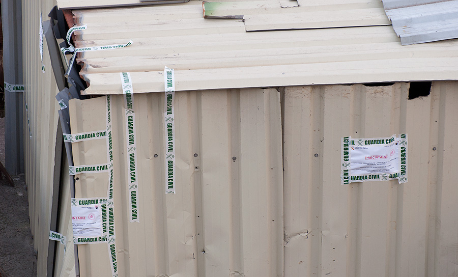 Una de las esquinas del cobertizo en la que la Guardia Civil ha colocado un cartel y varias tiras de cinta adhesiva