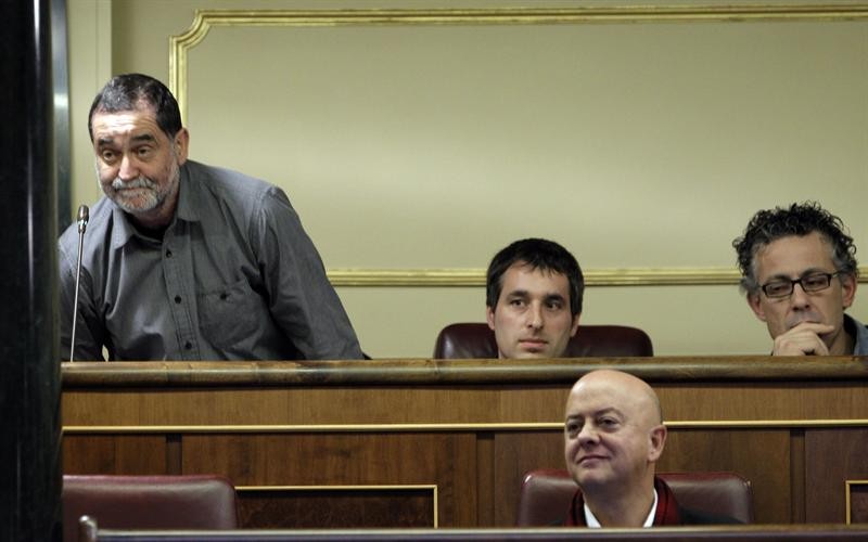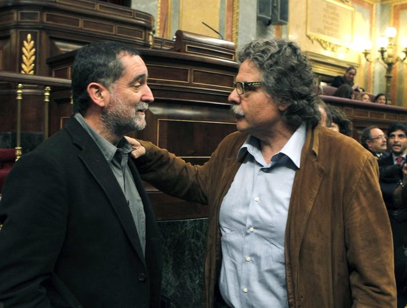 El diputado de ERC Joan Tardá (d) saluda cariñosamente al diputado de Amaiur.