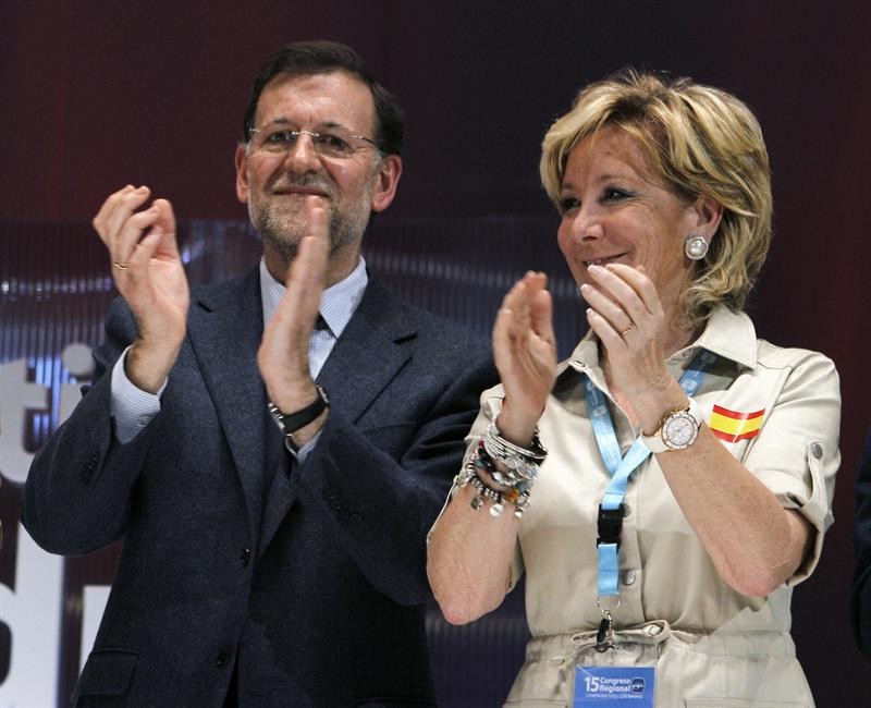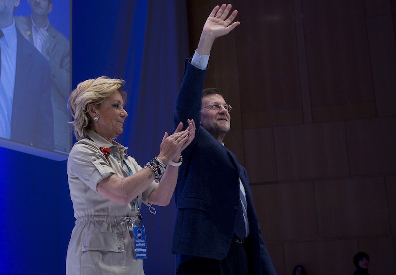 Esperanza Aguirre aplaude al final del acto de clausura del XV Congreso del PP de Madrid en el que ha sido reelegida como presidenta. Lo hace junto al presidente del Gobierno y de su partido, Mariano Rajoy.