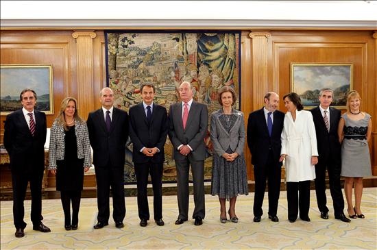 El nuevo vicepresidente primero del Gobierno, Alfredo Pérez Rubalcaba, y los nuevos ministros Ramón Jaúregui, Trinidad Jiménez, Valeriano Gómez, Rosa Aguilar y Leire Pajín, además de Manuel Chaves, han prometido sus cargos ante el Rey en un acto en el Palacio de la Zarzuela.