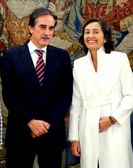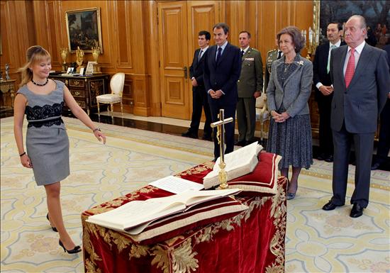 Una pletórica Pajín se dispone a prometer su cargo en presencia de los Reyes y de un sonriente Zapatero. EFE