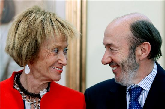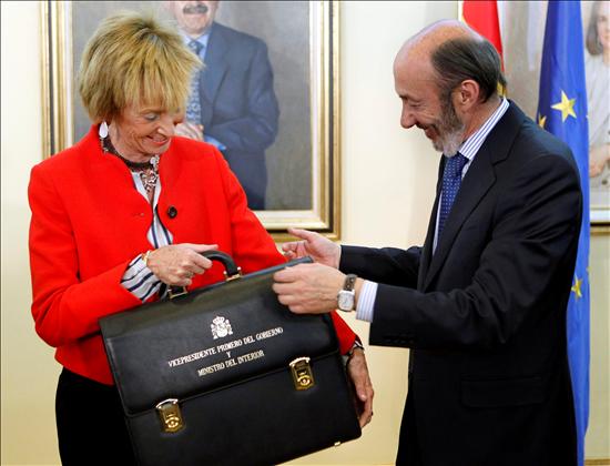María Teresa Fernández de la Vega se dispone a hacer entrega de su cartera a Alfredo Pérez Rubalcaba. EFE